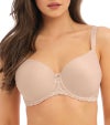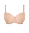 軽量かつ通気性に優れたスペーサーモールド素材が、ボリュームを加えることなく自然な仕上がりを実現したワイヤー入りモールドスペイサーブラ。カップ全体に施された幾何学的なエンボスデザインは、繊細な刺繍と調和し、洗練された美しさを演出します。ネックラインとアンダーアームには柔軟性を持たせ、着心地の良さを追求しました。