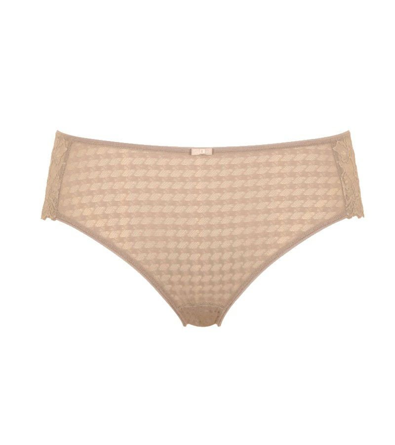 ジャガード織のシア―生地で透け感のある定番型ブリーフです。 後ろにはレースを使いブリーフラインがうつりにくいデザインに。