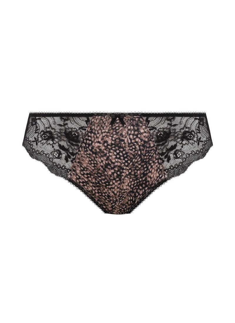 ウエストラインの高さがスタンダードタイプの通常型ブリーフです。フロントサイドには上質なストレッチレースが施され、フィット感のある快適な履き心地。お尻はしっかりとフルカバーになっています。全体にプリントが施された華やかな1枚です。