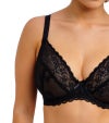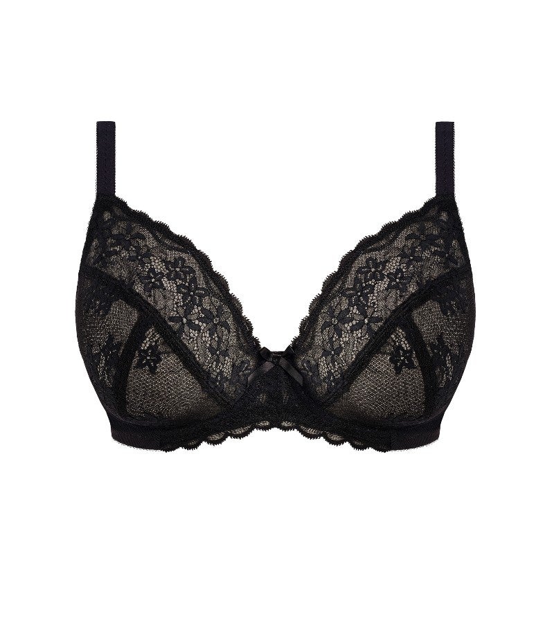 センターフロントを低く設計したプランジタイプで、デコルテを美しく引き立てます。カップはエイペックス部分をやや高めにすることで、プランジラインでありながらも安定したサポート力を実現しました。トップカップには可憐なフラワーレースを、カップ全体にも同柄のレースをあしらい、上品で統一感のあるデザインに仕上げています。