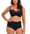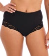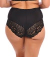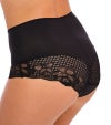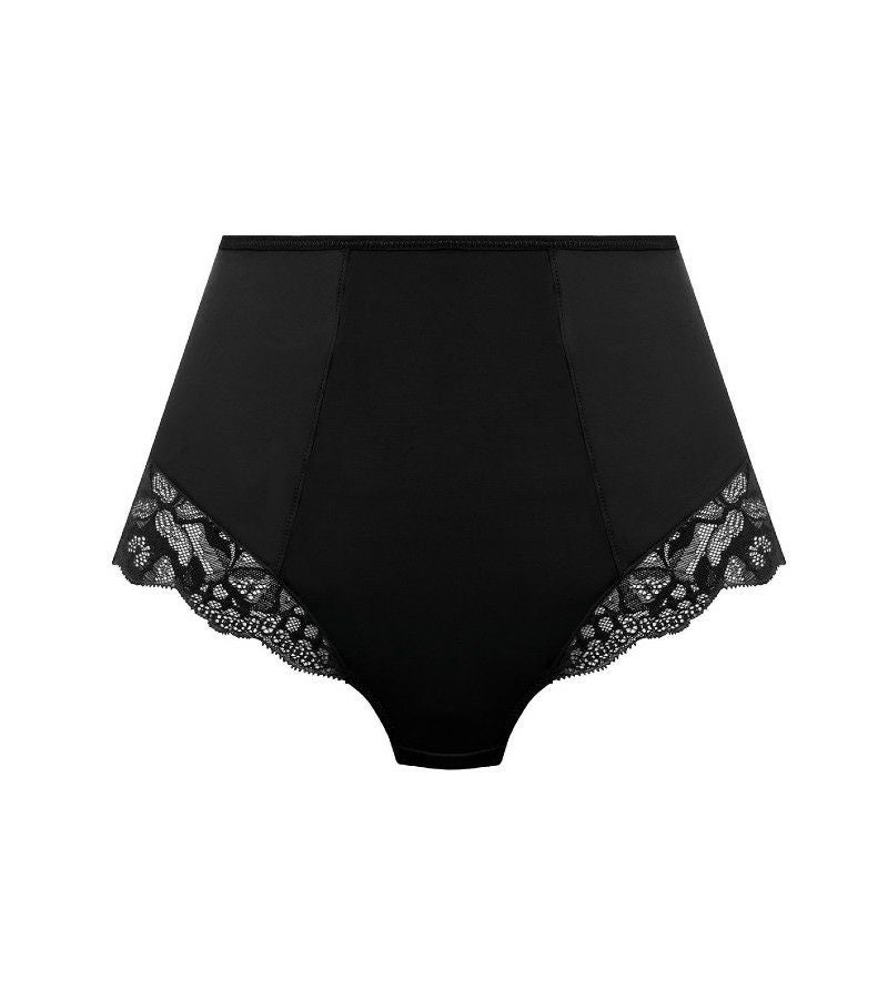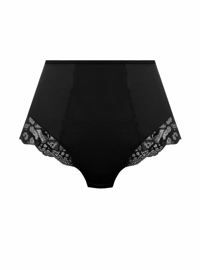 ソフトタッチで肌心地のよい生地を使ったハイウエスト型ストレッチブリーフ。おへそ辺りにインナーライナーをほどこし、ライトコントロール効果も。バックスタイルは華やかに、ヒップラインにレースをたっぷりあしらったデザインです。