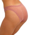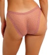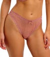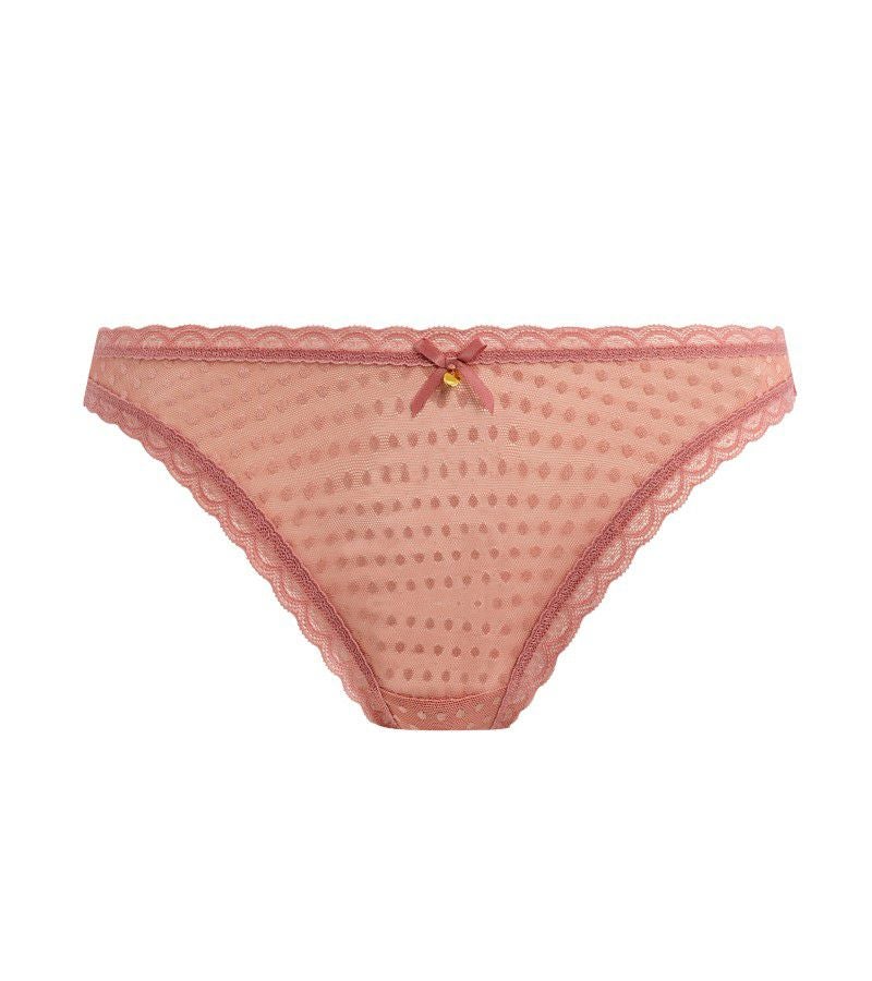 こちらのハイレグブリーフは、腰の高い位置で自然にフィットし、シアーなスポットメッシュデザインが軽やかさを演出。ウエストとレッグ部分にはストレッチレースをあしらい、柔軟性と優雅さを両立させます。中央フロントには、サテンリボンのボウにゴールドディスクチャームを添えた繊細なディテールが輝き、若々しく洗練されたスタイルを完成させます。