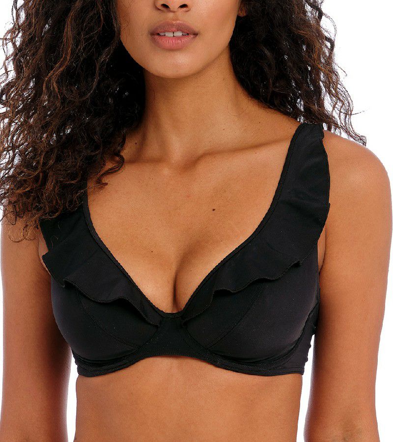 深めのプランジネックに、長めに設計されたエイペックスがデコルテを美しく引き立て、センシュアルな印象を演出します。ネックラインには流れるようなウォーターフォールフリルをあしらい、軽やかで優雅な動きをプラスしました。
