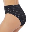 こちらのハイウエストビキニブリーフは、シックなブラックに映えるモノトーンのダイヤモンドプリントが印象的。レトロな雰囲気漂うハイウエストデザインがウエストラインを美しく引き立て、