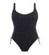 背面にはキーホールカットアウトを配し、バッククラスプで着脱もスムーズ。レッグラインはすくい上げるように美しくカットされ、自然で上品なカバレッジを実現します。サイドシームはギャザー仕様で、シルエットの微調整が可能です。