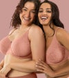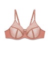 こちらのEnora UWミニマイザーブラは、ジャカードのシアーレース(やや透け感のある生地)を使用しており、無理なくバストを縮小するように設計されています。3枚パネルを縫製したカップはバストを押しつぶすことなくカプセル化し、2.5センチ~4センチ(約1カップ)ほどサイズダウン。薄いメッシュのライナー(裏地)をほどこしたフルカバレージタイプのカップです。マイクロファイバーのウイングにもメッシュのライナーをほどこし、しっかりとバストをサポートしてくれます。