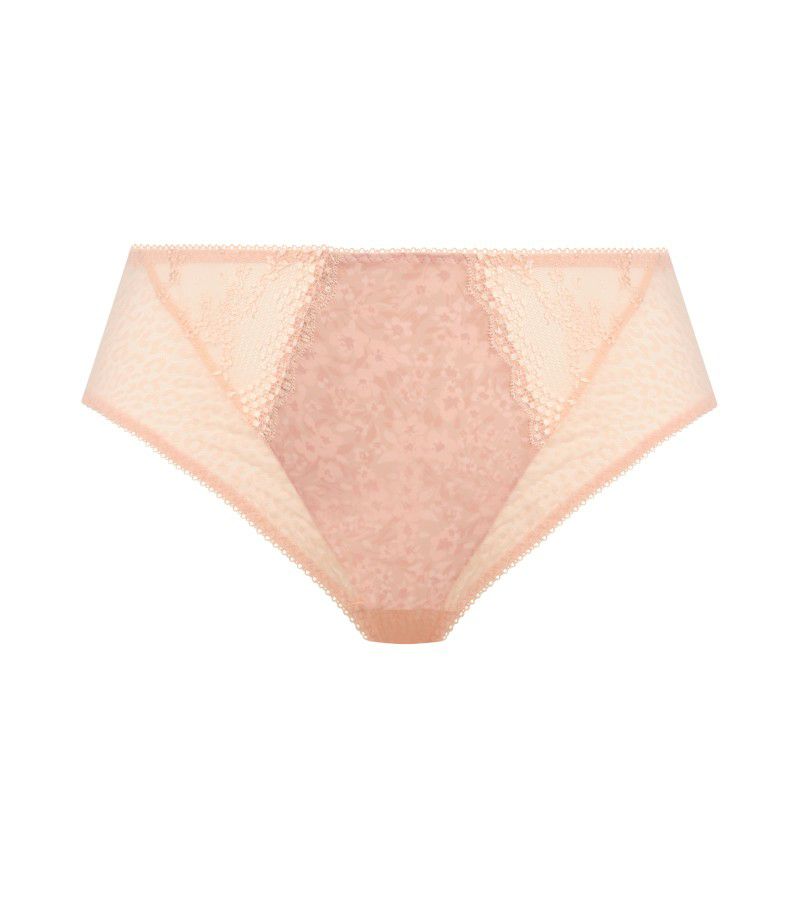 ウエスト丈で脚を美しく見せるハイカット仕様が特徴のハイレグブリーフです。フロントにはソフトなストレッチポリエステルのプリント生地を使用し、サイドには繊細なストレッチレースをあしらいました。 バックはレオパード柄のストレッチレースで仕立て、フェミニンさとモダンな印象を両立しています。
