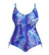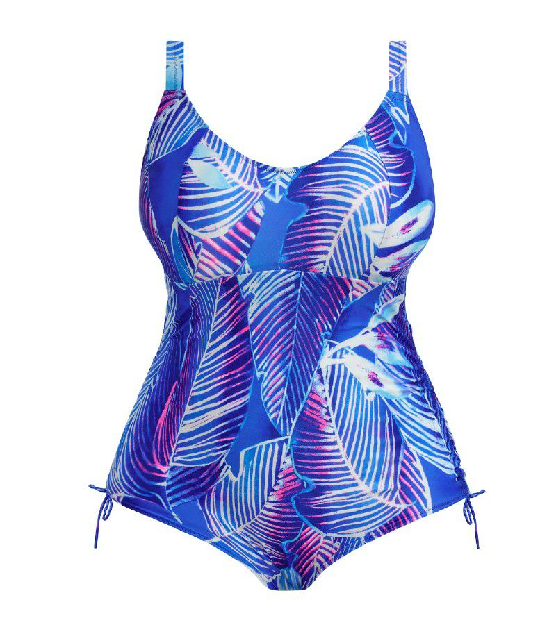 ブラサイズ設計により、確かなサポート力と美しいシェイプを実現したノンワイヤー型スイムスーツ。モールドカップを使用しない軽やかな構造で、リラックス感のある自然な着心地に仕上げました。幅広のアンダーバンドに配したインナーシェルフが安定感をもたらし、背面のクラスプ留めとスクープ型のキーホールバックで着脱もスムーズ。