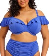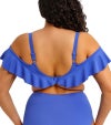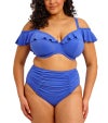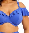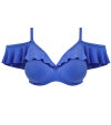 細めのストラップと、肩にのせてもオフショルダーとしても楽しめるラッフルが魅力のアンダーワイヤー入りプランジビキニトップ。見た目はビキニらしい軽やかさを保ちながら、軽量でありながらしっかり支えるライニングを施すことで、まるで Elomi のランジェリーブラのような安定感あるフィットを叶えています。