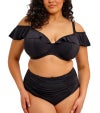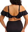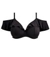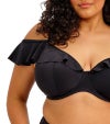 細めのストラップと、肩にのせてもオフショルダーとしても楽しめるラッフルが魅力のアンダーワイヤー入りプランジビキニトップ。見た目はビキニらしい軽やかさを保ちながら、軽量でありながらしっかり支えるライニングを施すことで、まるで Elomi のランジェリーブラのような安定感あるフィットを叶えています。