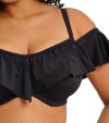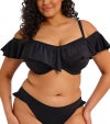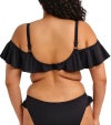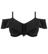 アンダーワイヤー入りのプランジビキニトップにフリルが施されたデザインのワイヤー入りフリル付きバルドービキニです。細めのストラップと、肩に乗せてもオフショルダーとしても楽しめるラッフルデザインが特徴です。