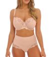 ソフトタッチで肌心地のよい生地を使ったハイウエスト型ストレッチブリーフ。おへそ辺りにインナーライナーをほどこし、ライトコントロール効果も。バックスタイルは華やかに、ヒップラインにレースをたっぷりあしらったデザインです。