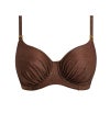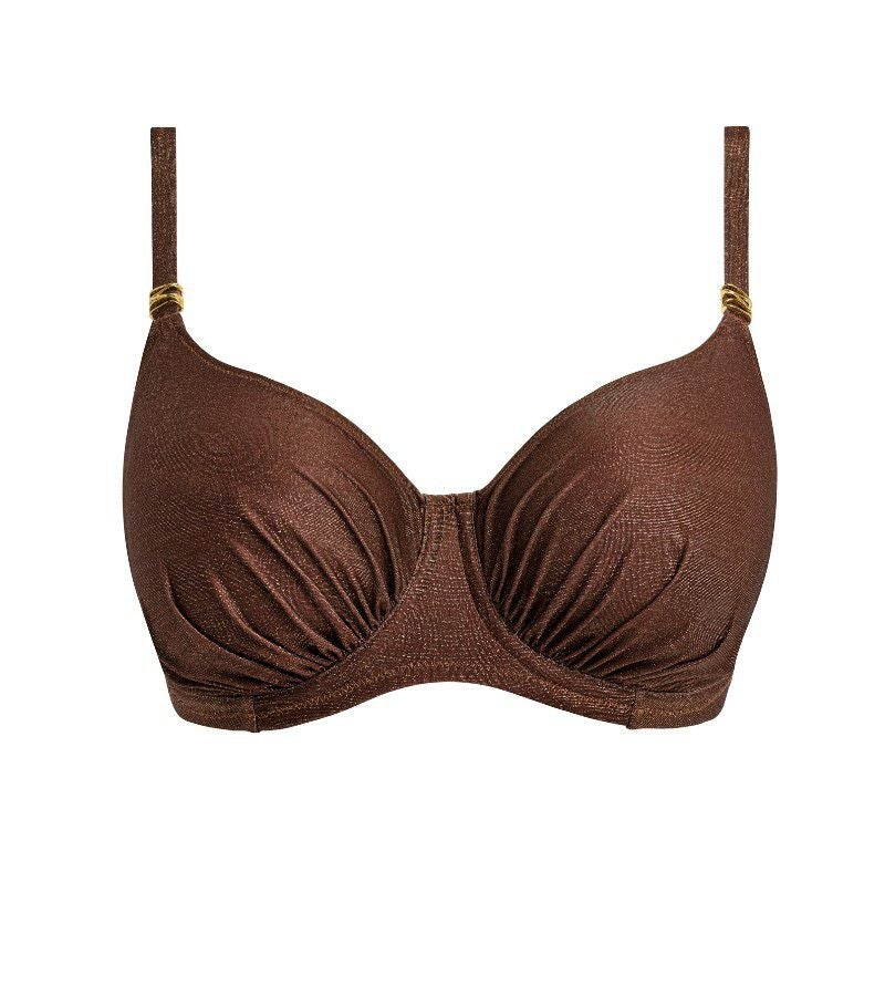 ギャザーを寄せたカップがあらゆるバストラインを美しく整えるワイヤー入りギャザーフルカップビキニ。包み込むようなフルカバレッジのカップには、内側にサイドスリングを忍ばせることで、自然な前向きのシルエットを演出します。ウィング部分はパワーネットで裏打ちし、安定感のあるサポートを実現。ストラップは長さ調整が可能な仕様で、体に沿う上品な着用感を叶えます。さらに、太陽の下でも熱を帯びにくいメタリックゴールドのアクセントをあしらい、洗練された印象に仕上げました。