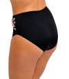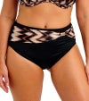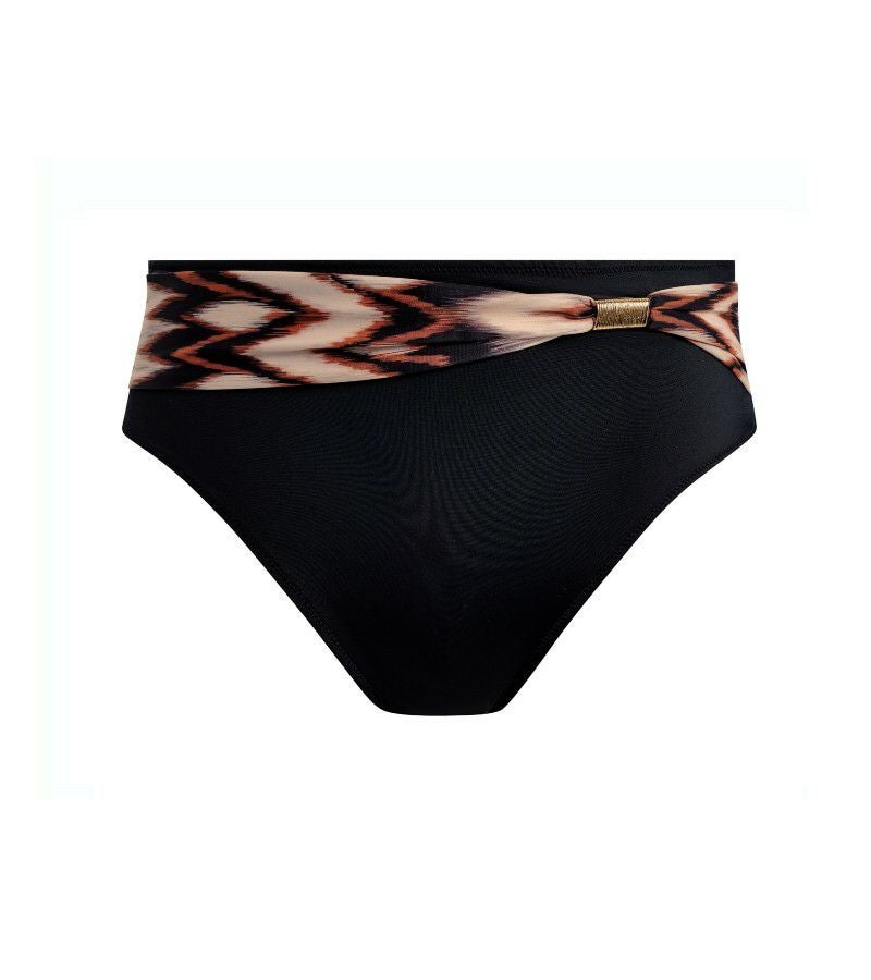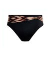 腹部まわりをしっかりカバーする安心のハイライズデザインのハイウエストビキニブリーフ。広めのプリントベルトには、日差しでも熱くならないゴールドのメタリックディテールを添え、洗練されたアクセントに。内部まで丁寧に総裏仕立てで、心地よくお召しいただけます。