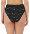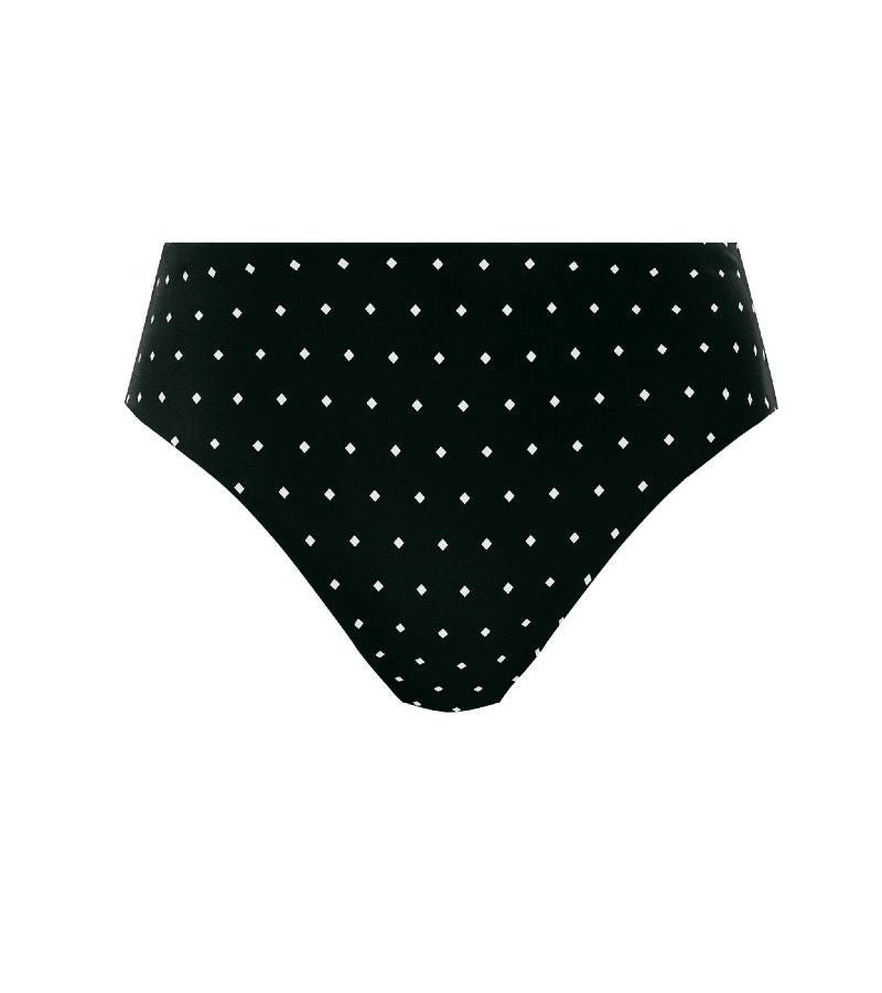 こちらのハイウエストビキニブリーフは、シックなブラックに映えるモノトーンのダイヤモンドプリントが印象的。レトロな雰囲気漂うハイウエストデザインがウエストラインを美しく引き立て、