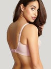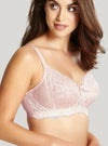 4枚パネル仕立て、ワイヤーなしのフルカップブラです。バストをしっかり安定させる裏打ちがカップ下部にほどこされ、カップトップのレースはストレッチメッシュの裏地あり。長さ調節可能なストラップでサイズ感を調節していただけます。睡眠時の着用もオススメです!