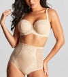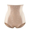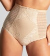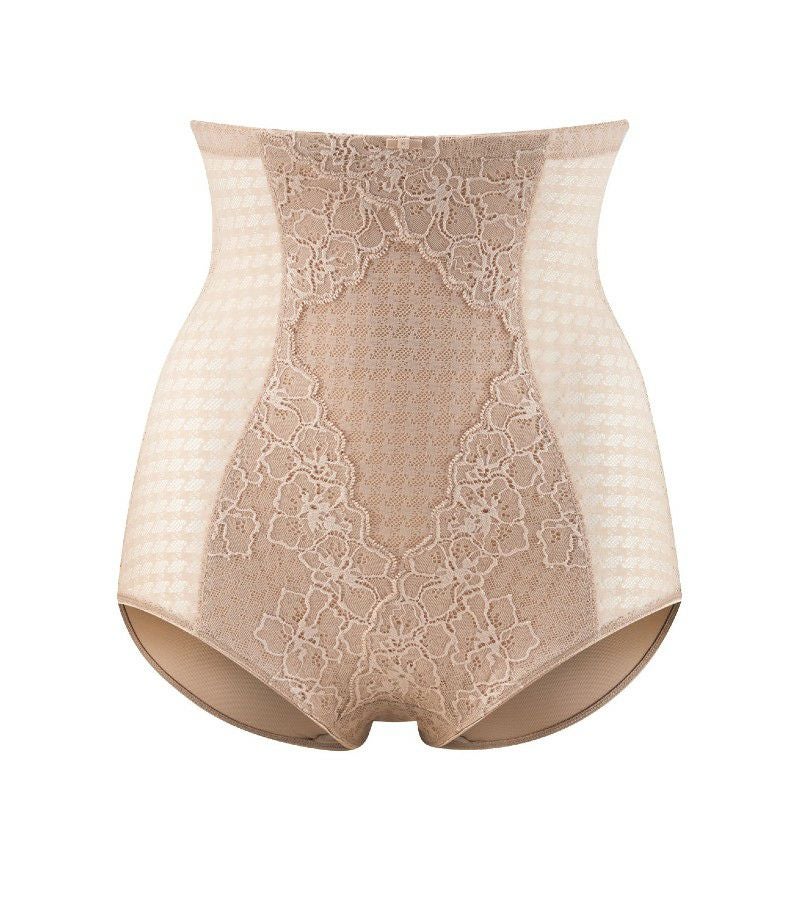 フロントのサポートパネルがぽっこりお腹を引き締めてくれる、シェイピング効果のあるハイウエウストブリーフです。 ゴージャスなレース飾りがフロントパネルにあしらわれたエレガントなデザイン。
