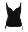 遊び心のあるスカラップデザインと少し深めのネックラインが特徴のタンキニトップ。ワイヤーと裏地によってしっかりとリフトアップとサポート効果を提供します。カップ上部にはレーザーカットによるスカラップエッジを施し、さらにラミネート加工されたスカラップエッジが生地の型崩れや巻き上がりを防ぎ、洗練された仕上がりになっています。