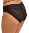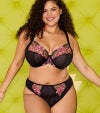 前面と背面の上部には、控えめなデザインを実現するためにダブルレイヤーのストレッチメッシュを使用しています。前面のレースパネルには、精密なプリント刺繍と柔らかいメタリック糸のディテールが施されています。ウエスト部分とバックキーホールには、滑らかなサテン調のゴムを使用し、前面と背面にはリボンのディテールが加えられています。