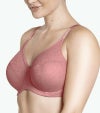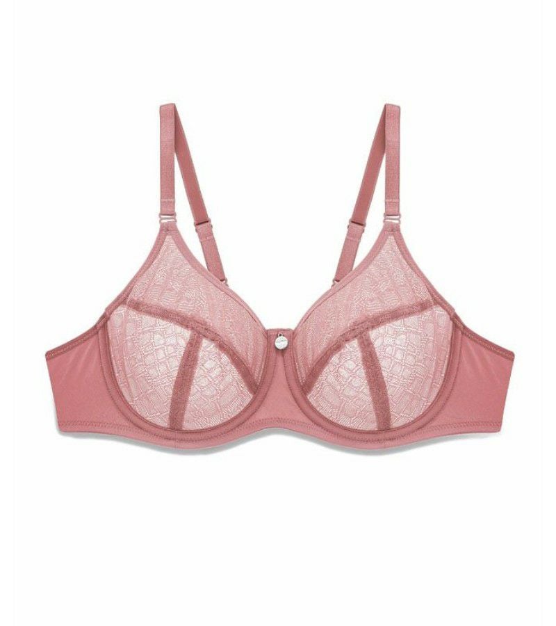 こちらのEnora UWミニマイザーブラは、ジャカードのシアーレース(やや透け感のある生地)を使用しており、無理なくバストを縮小するように設計されています。3枚パネルを縫製したカップはバストを押しつぶすことなくカプセル化し、2.5センチ~4センチ(約1カップ)ほどサイズダウン。薄いメッシュのライナー(裏地)をほどこしたフルカバレージタイプのカップです。マイクロファイバーのウイングにもメッシュのライナーをほどこし、しっかりとバストをサポートしてくれます。