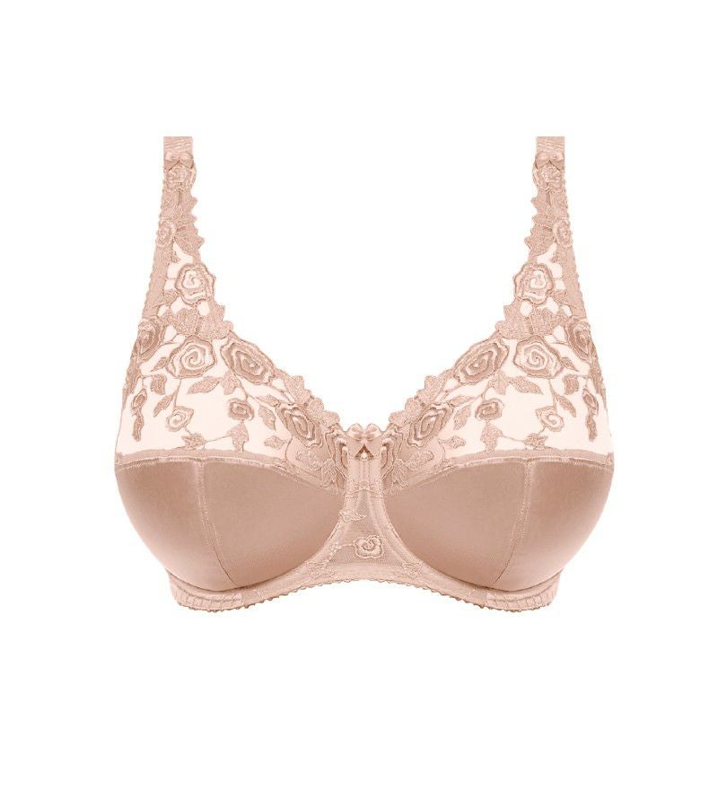 3枚パネル仕立てでカップトップからストラップにかけてサテン刺繍が施されたデザイン。 パッドなしのライトな付け心地、バスト全体を覆ってくれるフルカップはグラマーさんに一番人気です。