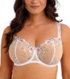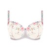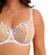 ワイドワイヤー設計により、快適な着用感と安定したサポート力を実現しました。縦の切り替えを施したカップは、パッドに頼ることなく自然なバストラインを整え、美しい谷間とリフトアップ効果をもたらします。カップ全体にはラグジュアリーなプリント刺繍をあしらい、上品な華やかさを添えました。