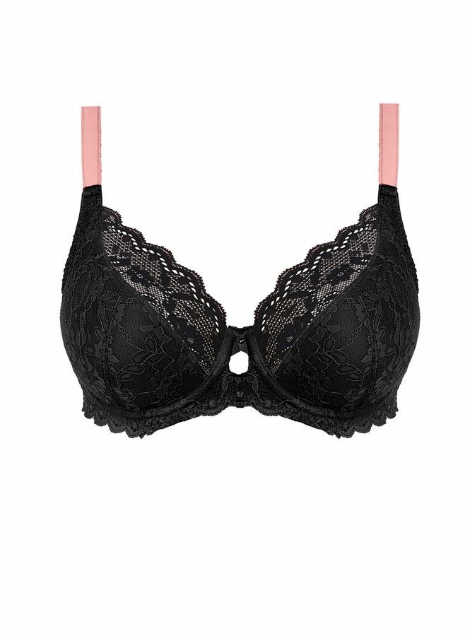Fanciesプランジブラと同じ縫製で作られたVネック型レースブラ。カップ上部はストレッチが効き、カップが浮きにくいデザインです。3枚のパネルを合わせて作られたカップは、外側(脇側)の生地がストラップまで続き、自然にバストをリフトアップしてくれる効果も。センターのキーホールがポイントになった素敵なランジェリーです。
