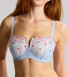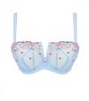 やわらかなダスキーブルーに、リボンモチーフと小さなハートを散りばめた刺繍をあしらった、印象的なデザイン。サスペンダーを合わせれば、夏の高揚感をそのまま閉じ込めたような、完成度の高いセットに。ランジェリーコレクションに加えたい、まさにアートピースのような一着です。
