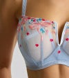 フロント中央のVワイヤーデザインが、モダンで洗練された印象をプラス。リボンとハートをあしらったスイス製刺繍が、繊細でフェミニンな表情を引き立てます。