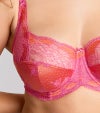 カップ上部のソフトレースがバストラインに沿い、胸元を美しく演出。GGカップ以上にはより強いアンダーバンドを使用しサポート力も強化されています。