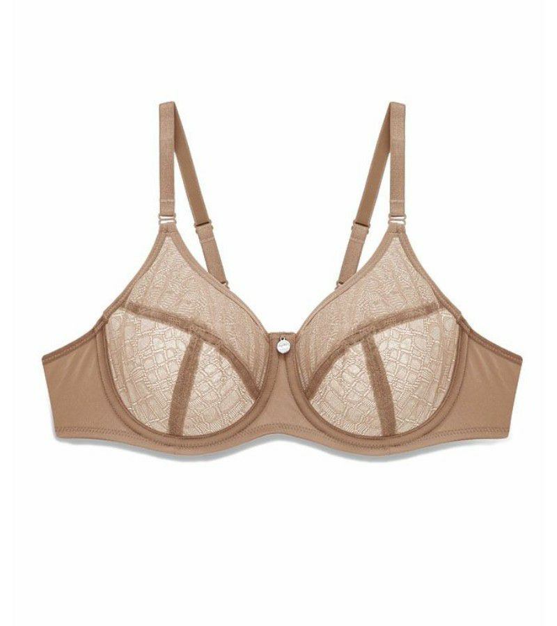 こちらのEnora UWミニマイザーブラは、ジャカードのシアーレース(やや透け感のある生地)を使用しており、無理なくバストを縮小するように設計されています。3枚パネルを縫製したカップはバストを押しつぶすことなくカプセル化し、2.5センチ~4センチ(約1カップ)ほどサイズダウン。薄いメッシュのライナー(裏地)をほどこしたフルカバレージタイプのカップです。マイクロファイバーのウイングにもメッシュのライナーをほどこし、しっかりとバストをサポートしてくれます。