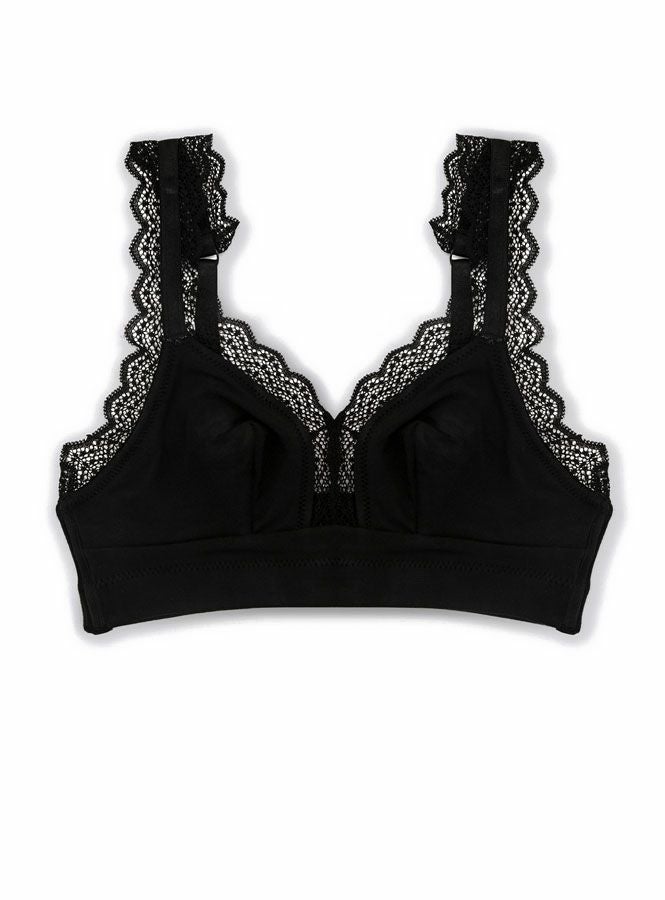 ストレッチレースを用いたサポーティブなブラレット(ワイヤーフリータイプ)。 レースをネックライン、ストラップ、背中にあしらったフェミニンなデザインです。 インナーライナーをほどこし、カップ内側のサイドスリングがバストを前に寄せキープしてくれます。 背中のJホックを留めていただくと、サポート効果がアップ!