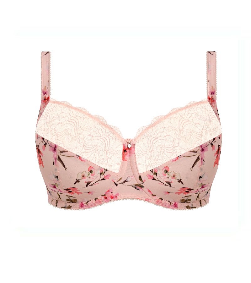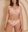 3枚接ぎのカップにサイドサポートパネルを組み合わせることで、優れたリフトアップ効果と前方への美しいプロジェクションを実現。カップ上辺とクレードルには繊細なストレッチレースを重ね、洗練された華やぎを添えています。