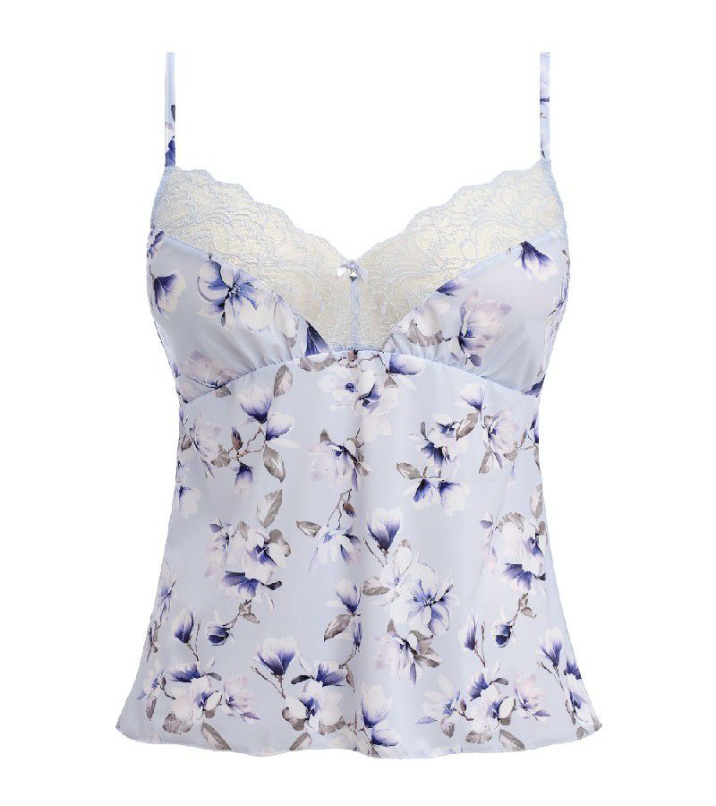 優雅さと快適さを兼ね備えたキャミソール。ネックラインを彩る伸縮性のあるレースが繊細な美しさを添え、バスト下の柔らかなギャザーが自然なシェイプを叶えます。ストラップは調整が可能で、体型に合わせたフィット感を提供します。柔らかな手触りのプリント生地が心地よく、中央フロントにはメタリックチャーム付きの愛らしいリボンディテールが、上品なアクセントとして輝きます。