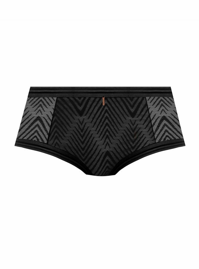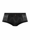 ストレッチの効いた幾何学模様レースを使ったボーイレッグ型ショーツです。しっかりとヒップ全体をカバーします。 薄い裏地を前面にほどこし、透け感を抑えたデザイン。