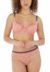 人気オフビートがよりフェミニンな色"ローズヒップ"で再登場。ピンクのフローラルレースで作られ、コントラストにグレーを配色しています。レースはストレッチが効き、耐久性の高い生地となっております。
