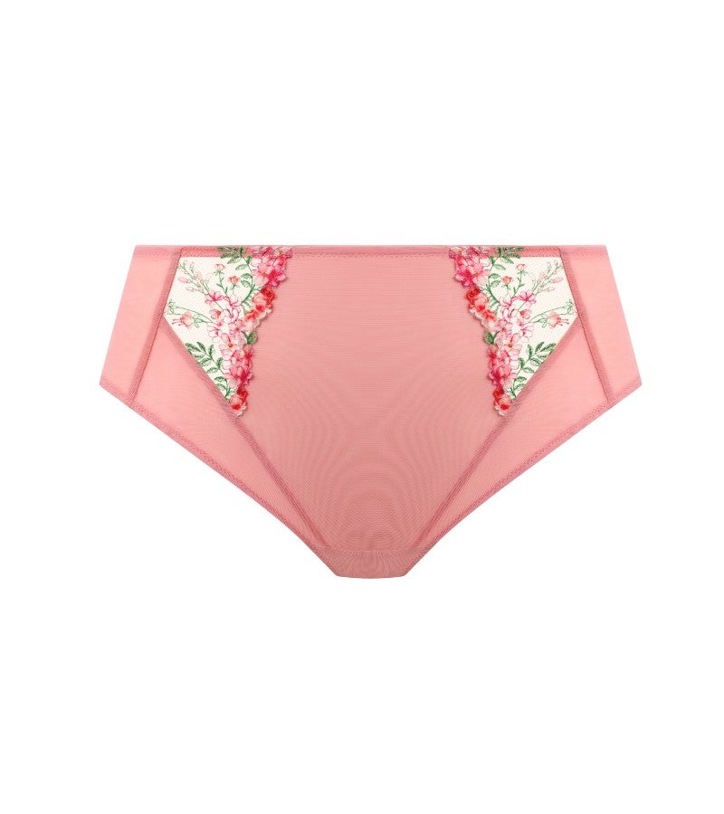 フロントとバックには二重構造のストレッチメッシュを使用し、透けを抑えた安心感のある仕上がりに。バックのレッグラインは折り返し仕様で、なめらかなシルエットを実現し、アウターに響きにくいデザインです。さらにサイドフロントには繊細な刺繍のインセットパネルをあしらい、さりげない華やかさを添えています。