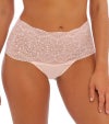 ワンサイズでXS〜XL(日本サイズS~3L)をカバーする革新的なストレッチ素材を使用したブリーフです。 アールデコからインスパイアされた装飾的なレースにもしっかりとストレッチが効いています。レース部分はフラットレースですので、衣服の下で目立たちにくいデザインです。まさに快適さとスタイルを融合させた、日常使いにぴったりのアイテムです。非常に柔らかい生地で作られており、まるで何も身に着けていないかのような感覚と、衣服の下で目立たない仕上がりを提供します。 ウエスト、付け根部分も圧迫感を最大限抑えたふんわりフィットです。