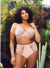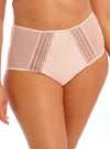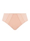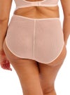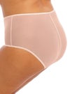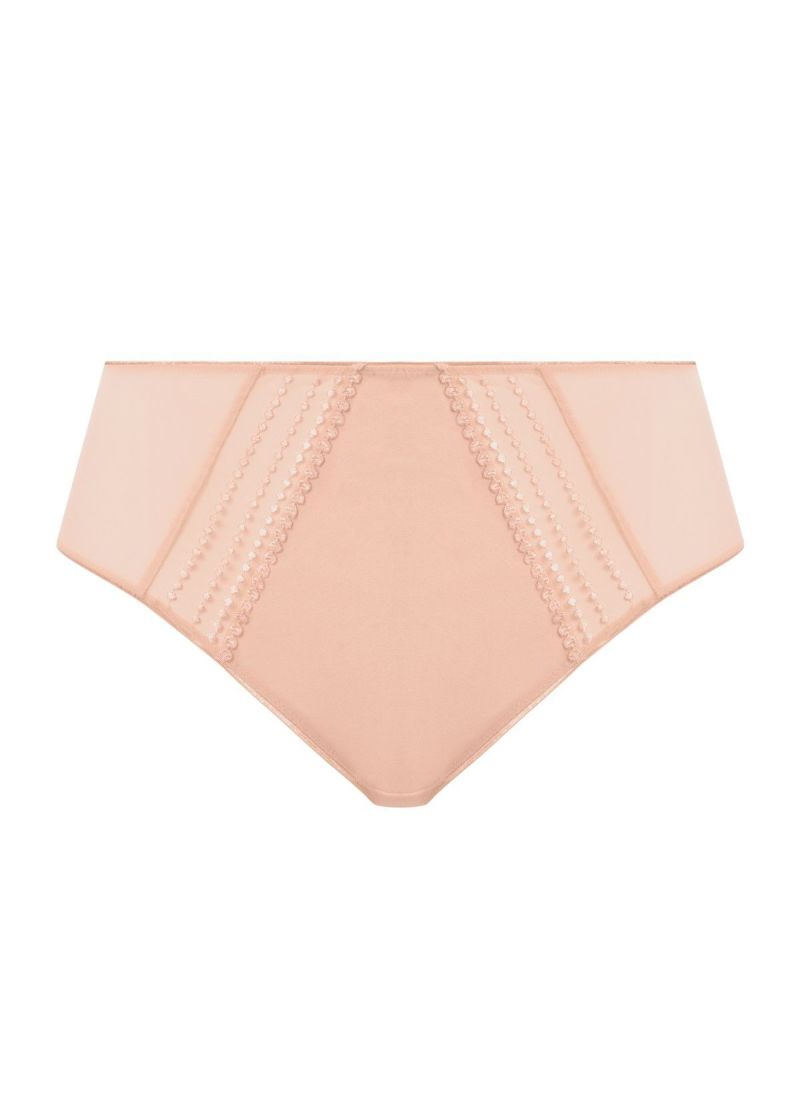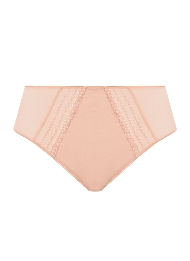 シアー生地を背面に使い、ウエストラインがやや高めに作られたフルブリーフです。腰回りがすっぽりと隠れ、お腹辺りまでカバーしてくれます。刺繍が素敵なデザイン。コットンクロッチ付きで安心の履き心地です。