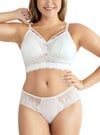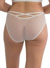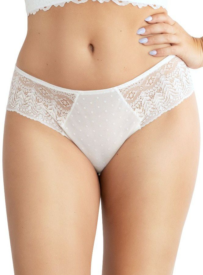 ParfaitのMiaシリーズのブラと一緒に着用いただけるブリーフシリーズです。前後にドットメッシュ、サイドにレースで透け感のある涼しげなデザイン。前中央部分は裏地があり、透け感を抑えています。セクシーな印象を加えるバッククロスストラップが特徴です。