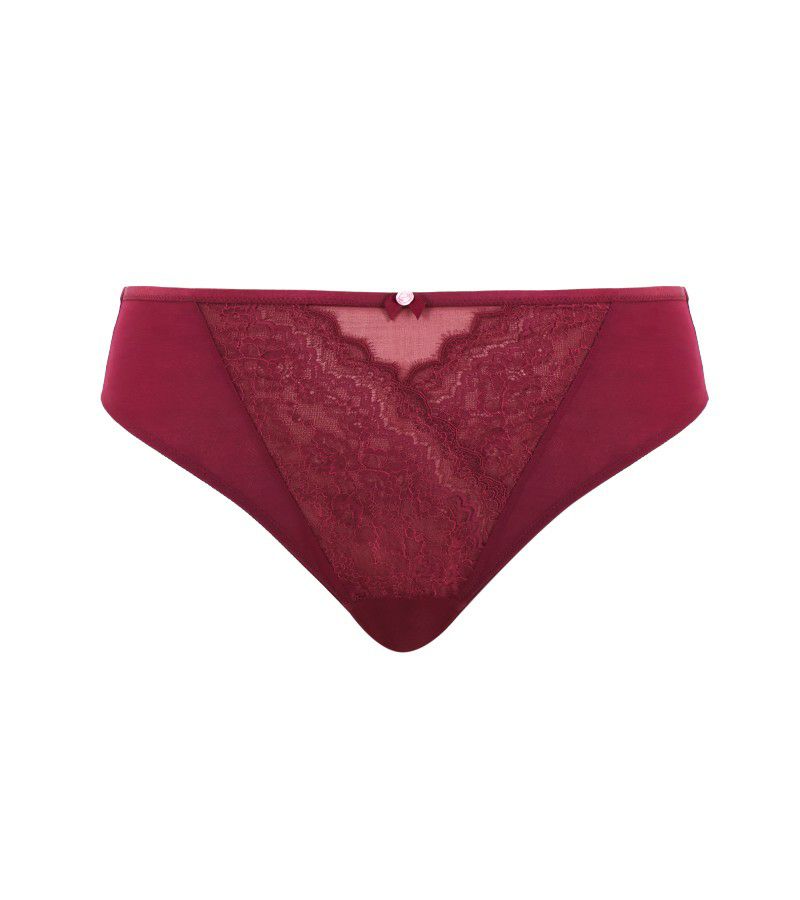 センターフロントにたっぷりとレースをあしらったハイレグ型ブリーフです。おへそ辺りまですっぽりと隠れ、安心感のある着心地。バックスタイルはシンプルに仕上げ、アウターを邪魔しないデザインです。