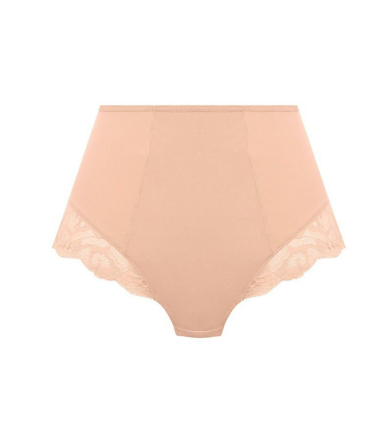 ソフトタッチで肌心地のよい生地を使ったハイウエスト型ストレッチブリーフ。おへそ辺りにインナーライナーをほどこし、ライトコントロール効果も。バックスタイルは華やかに、ヒップラインにレースをたっぷりあしらったデザインです。