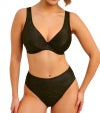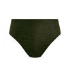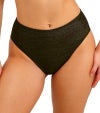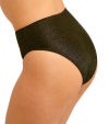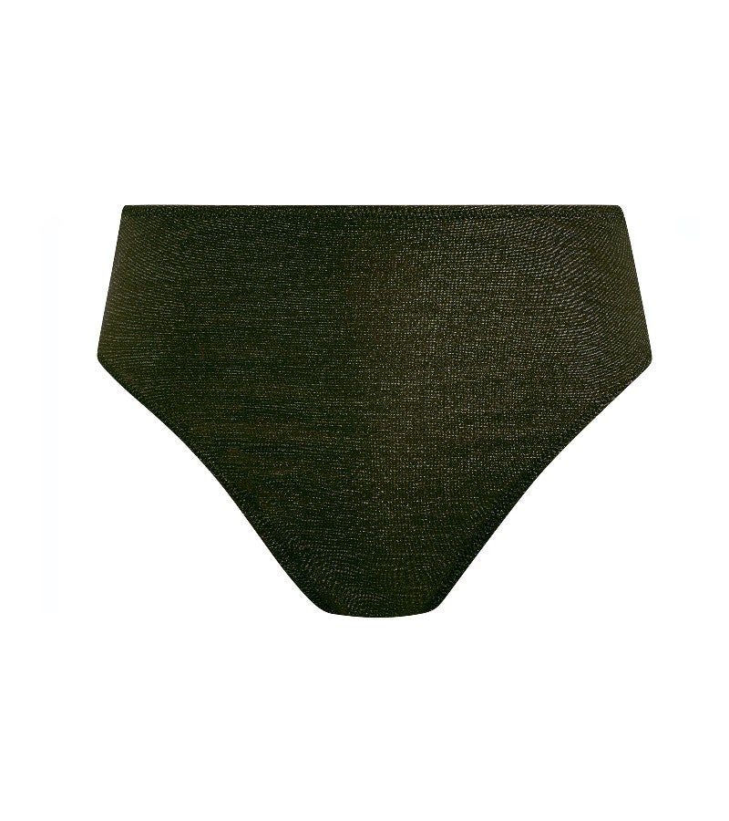 ウエスト高めのハイウエスト設計に、脚ぐりはスクープカットのレッグラインを採用し、バランスのよいすっきりとしたシルエットを演出します。ヒップは適度なカバレッジで安心感のあるはき心地に。生地にはトレンド感のあるゴールドカラーのメタリック糸を織り込み、さりげない華やかさを添えています。