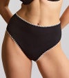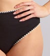 ウエストはやや高めに設定され、すっきりとしたバランスの良いシルエットを演出します。洗練されたバランスで、プールサイドでも上品でシックな印象を演出します。エッジにはホワイトのウィップステッチをあしらい、軽やかなアクセントをプラスしました。