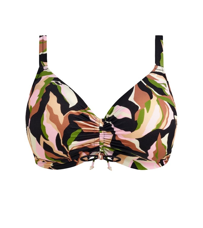 カップ、ストラップ、バックには、LYCRA® XTRA LIFE™エラスタンを使用したストレッチプリントファブリックを採用しています。さらにバックにはパワーネットの裏地を配し、しっかりとしたサポート力をプラス。肩ストラップは長さ調節が可能で、フィット感をお好みに合わせて調整できます。