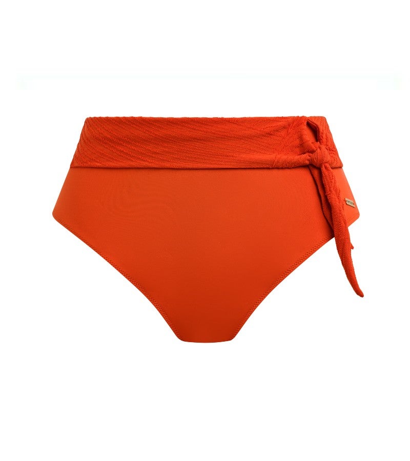 安心感のあるハイライズ設計と、やや高めにカットされたレッグラインが、バランスよくスタイルを引き立てます。ウエストは折り返し仕様で、リボンタイのディテールをプラス。