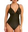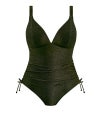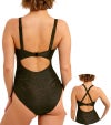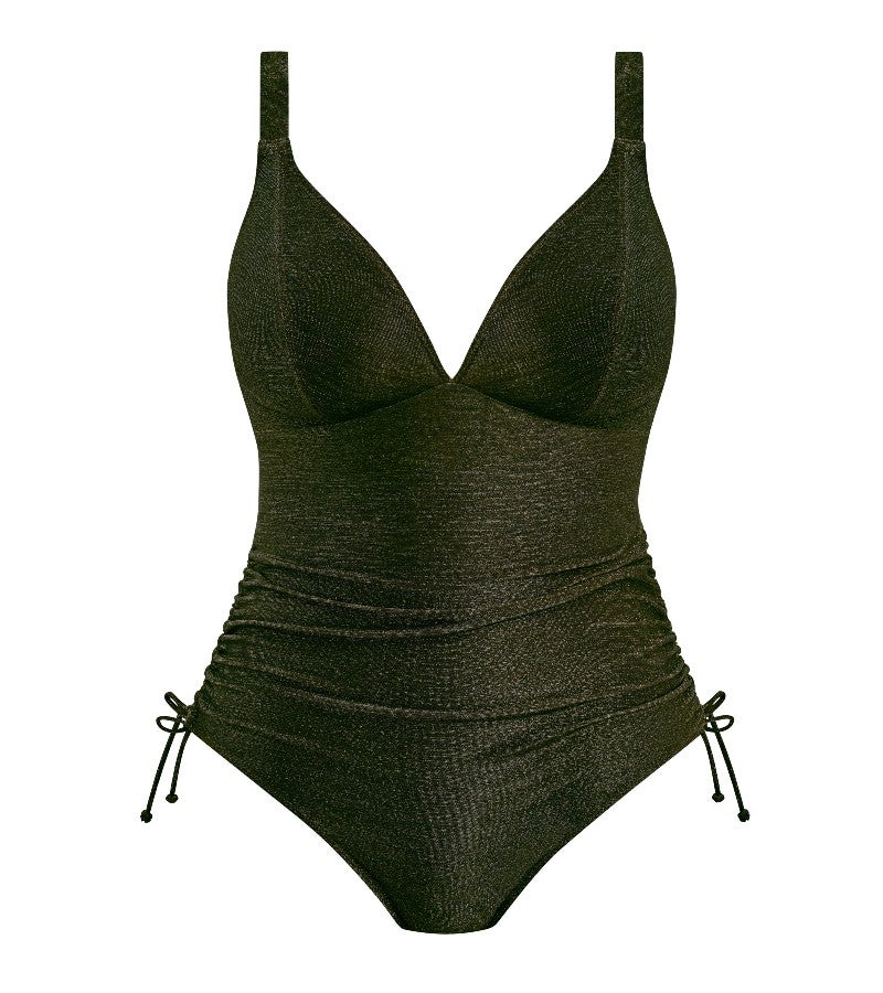 サイドシームのギャザーディテールによりフィット感の調整が可能で、軽やかなカバレッジを演出。背面はスクープ状のキーホールデザインにバッククラスプ留めを組み合わせ、洗練された印象と着脱のしやすさを両立しています。
