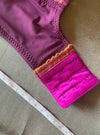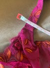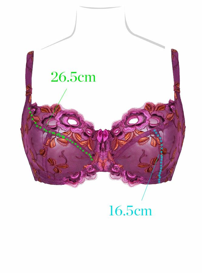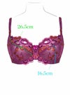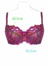 ジューシーなカシス色のチュールにレーザーカットで丁寧に作られた光沢のあるアプリケ。そして明るいブロンズカラーの刺繍をたっぷりあしらったジュエルシリーズです。ストレッチを効かせず、薄く柔らかなチュールを使ったカップはリフトアップ効果あり。カップ下部は垂直に生地を縫製し、無理なく胸を引き上げ綺麗なシルエットに導いてくれる設計です。(チュールは2枚レイヤー仕立て)ウイングはストレッチ生地を重ね脇や背中からボディ全体をサポートするデザインです。