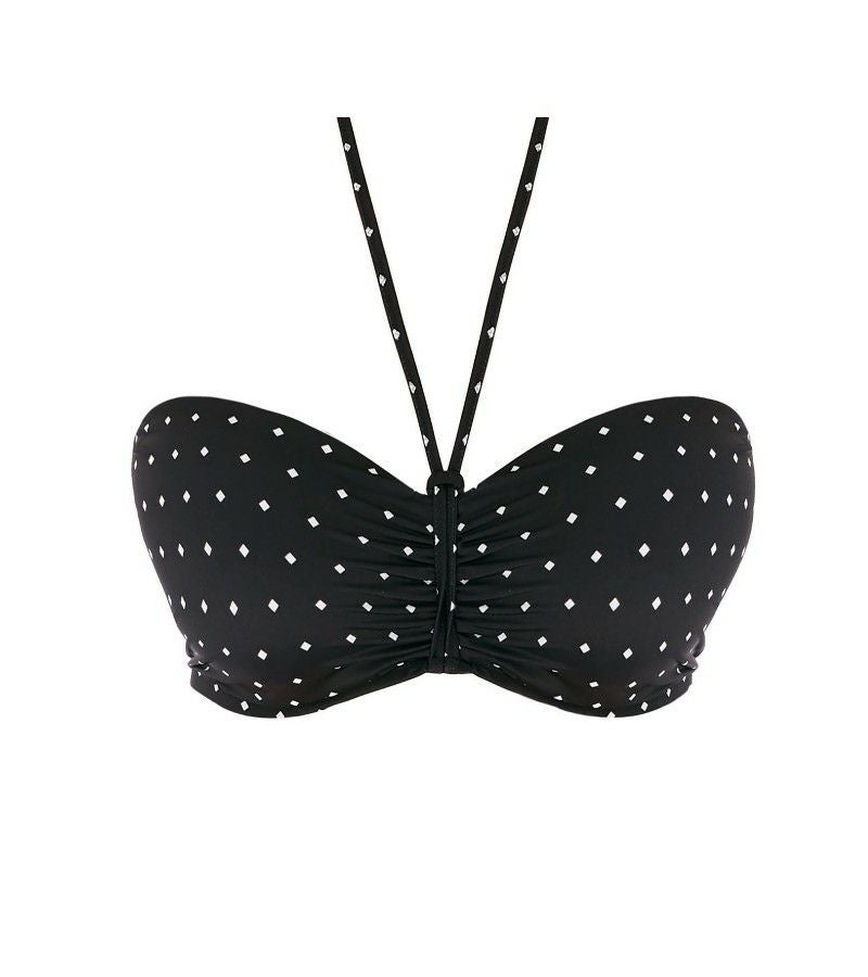 こちらのバンドゥビキニトップは、洗練されたブラックに映えるクラシックなダイヤモンドプリントが魅力。