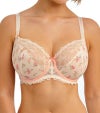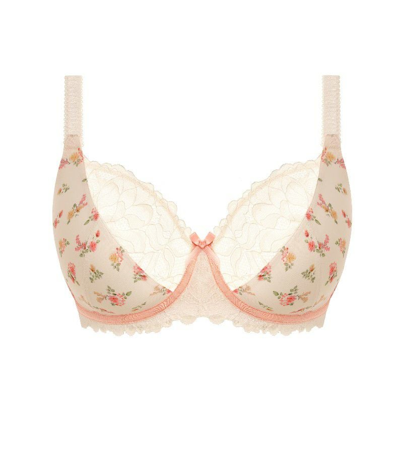 低めに設計されたセンターフロントが、すっきりとしたプランジネックラインを演出します。プッシュアップに頼らず、自然なバストラインを叶えるデザイン。オリジナルのフローラルプリントが、フェミニンな印象を添えています。